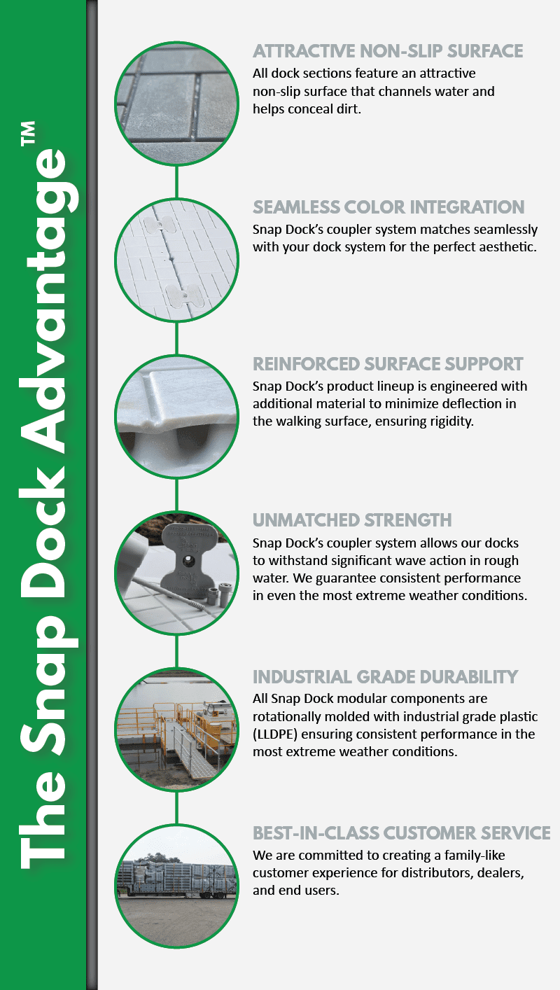 Our most popular and versatile dock section, the 60 inch dock section is a great choice for everything from a small 10×10 platform to a marina layout. This dock section can be configured with our other products (4060, 40 inch, 80 inch dock section, or Snap Port) to assemble a waterfront dock system that suits your needs. This dock section is resistant to corrosion and weathering, making it ideal for use in marine environments. It’s also slip-resistant and stable, making it a safe and secure option.