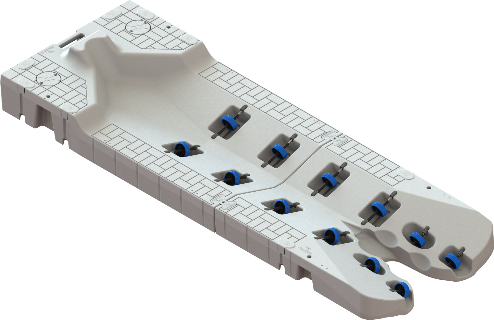The two-piece floating PWC lift is the perfect solution to protect your personal watercraft (PWC) from the elements, providing easy access to your dock. This lift is capable of supporting up to 1750 lbs./ 794 kgs, and is designed to fit the largest three-seater PWC’s on the market. The two-piece design consists of two heavy-duty plastic components that, when combined, create a large and stable platform with a total dimension of 14’x 5′. The system is connected via our patent-pending coupler system that flexes for a smooth on-and-off experience. The modular two-piece design also allows for easy installation of the product. The V-shaped design of the port entry also helps to reduce drag and resistance, making it easier to move the PWC in and out of the water. The lift also features adjustable rollers on the port, making it compatible with any PWC hull design, including top brands such as Seadoo and Yamaha.